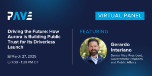 Autonomous trucking leader Aurora is on the verge of a history-making launch in long-haul trucking: commercialization of its self-driving system, the Aurora Driver. Join us on Thursday, March 27, for a fireside chat with Aurora Senior Vice President of Government Relations and Public Affairs, Gerardo Interiano, to hear the behind-the-scenes work that got them to this pivotal moment: How long has it taken them to prepare for a driverless launch? How do you know when the technology is ready? And how do we prepare the public to share the roads with driverless trucks?